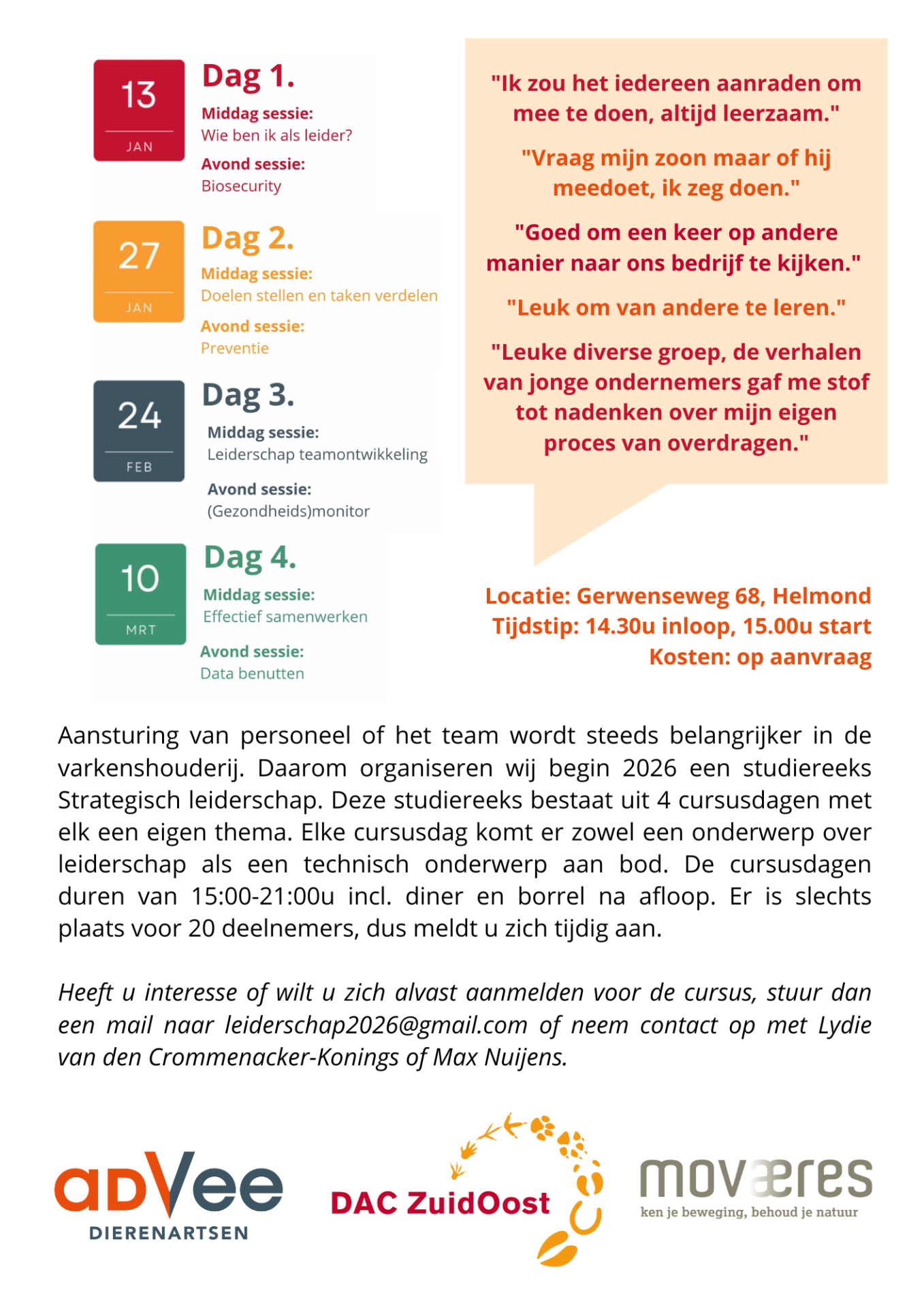 Aansturing van personeel of het team wordt steeds belangrijker in de varkenshouderij. Daarom organiseren wij komend najaar (in samenwerking met movaeres) een studiereeks Strategisch leiderschap. Deze studiereeks bestaat uit 4 cursusdagen met elk een eigen thema. Elke cursusdag komt er zowel een onderwerp over leiderschap als een technisch onderwerp aan bod. De cursusdagen duren van 15:00-21:00u incl. diner en borrel na afloop. Er is slechts plaats voor 18 deelnemers, dus meldt u zich tijdig aan. De cursusdagen vinden plaats op dinsdag 19 september, 10 oktober, 31 oktober en 14 november.